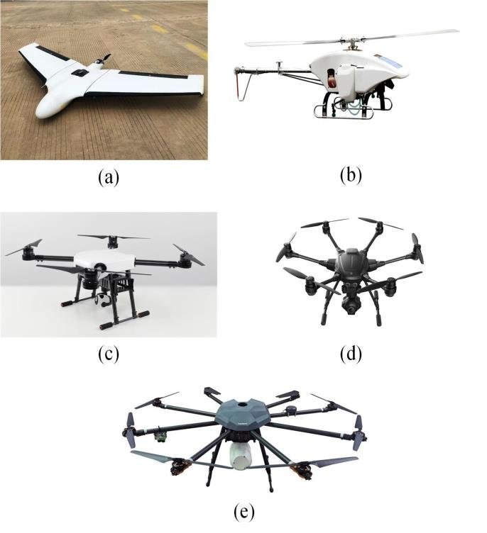 There are five types of drones, as shown in the above image, such as (a) Fixed wing, (b) Single rotor, (c) Quadcopter, (d) Hexacopter, and (e) Octocopter drone.
