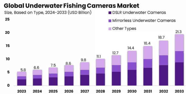 - The global underwater fishing cameras market is projected to reach from USD 5.8 billion in 2023 to USD 21.3 billion by 2033, with a compound annual growth rate (CAGR) of 13.9% from 2024 to 2033.
