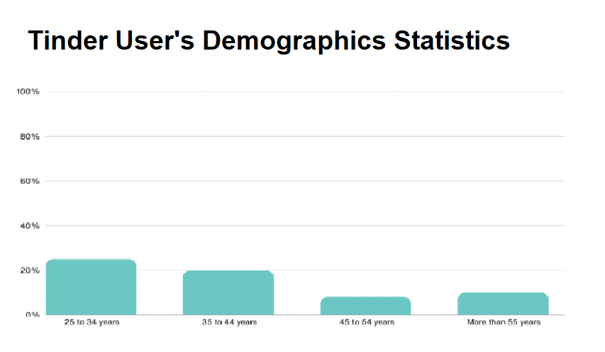 - Similarly, other users share Tinder at the same time, as 25% of users are 25 to 34 years old, 20% (35 to 44 years old), 8% (45 to 54 years old), and 10% (over 55 years old).