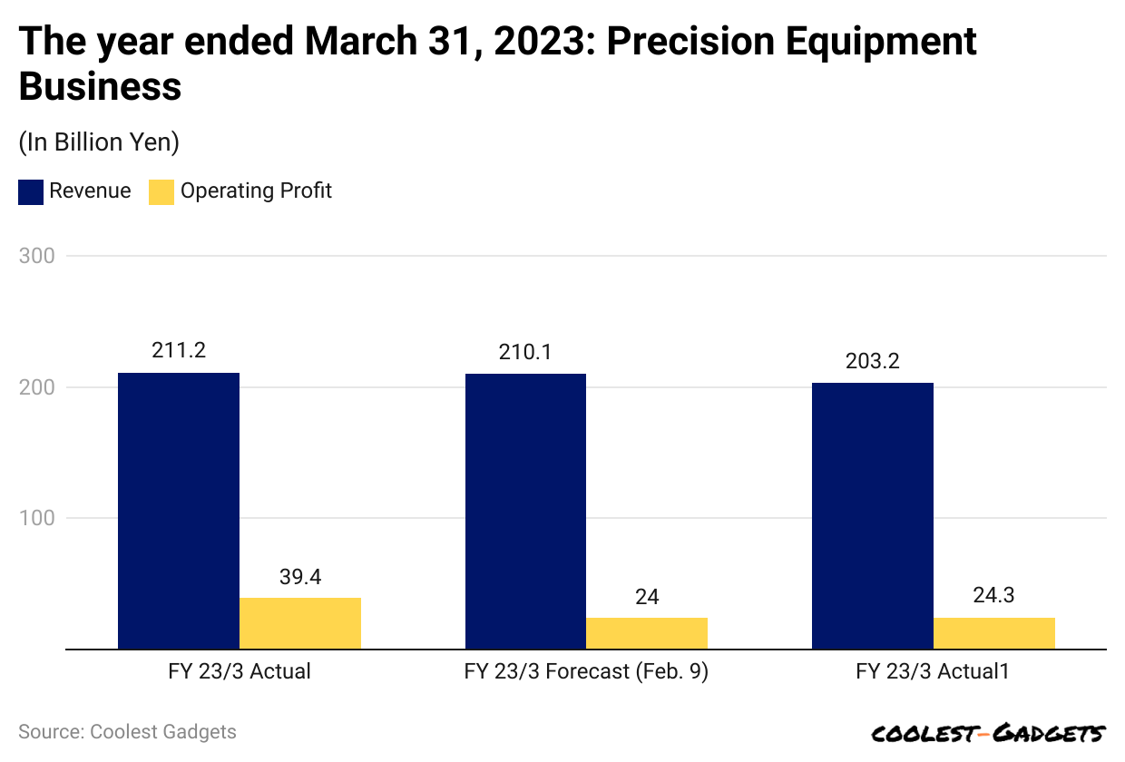 - Other segment’s revenue and operating profits are followed by the components business (53.9 billion yen and 14.6 billion yen), industrial metrology, and others (44.3 billion yen and .6 billion yen), respectively.