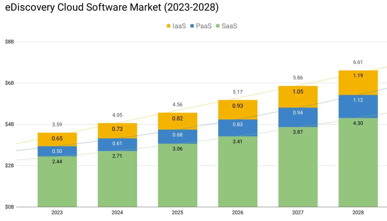 - The portion of eDiscovery spending dedicated to data collection was projected to be 14% ($1.83 billion) of the total market in 2021, increasing to 19% ($3.59 billion) by 2026.