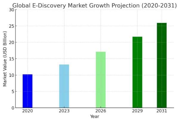 - The global eDiscovery market was valued at $10 billion and is predicted to grow at an annual rate of 6-9% through 2025.