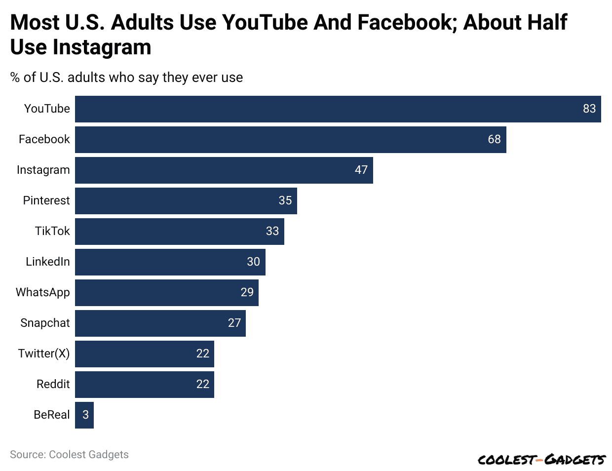 - Furthermore, user shares of other social media sites are YouTube (83%), Facebook (68%), Instagram (47%), Tiktok (33%), LinkedIn (30%), WhatsApp (29%), Snapchat (27%), Twitter (22%), Reddit (22%), and BeReal (3%).